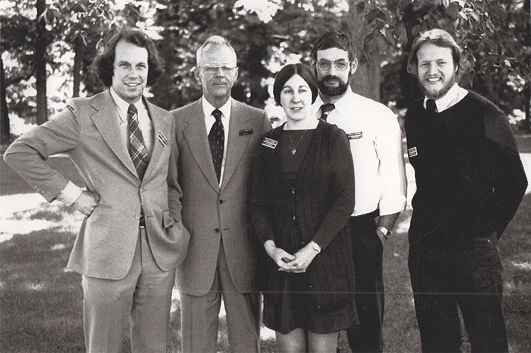 Presentation at the Smithsonian. From left to right: William Behrens III, Jørgen Randers, Aurelio Peccei, Dennis Meadows, Donella Meadows (obscured by podium) and William Dietel, president of Potomac Associates.