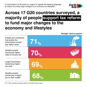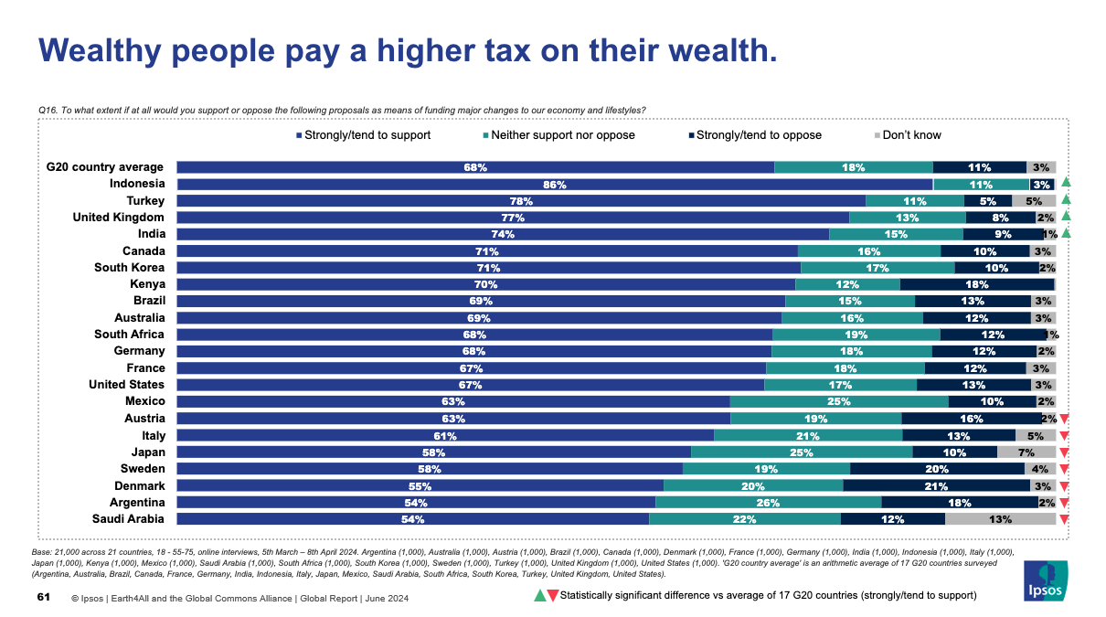 - Across 17* G20 countries surveyed, a majority of adults (68%**) support the policy proposal where wealthy people pay a higher tax on their wealth, as a means of funding major changes to our economy and lifestyles.