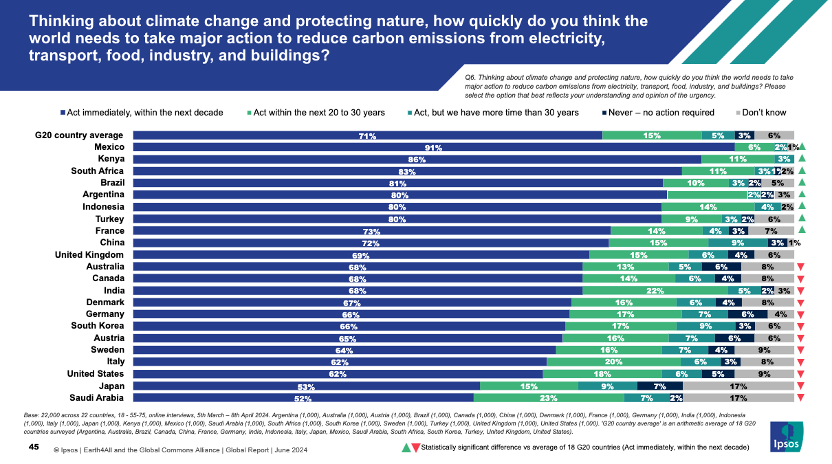 - When thinking about climate change and protecting nature, 71% of people across 18 G20 countries surveyed believe major action is needed immediately – within the next decade – to reduce carbon emissions.